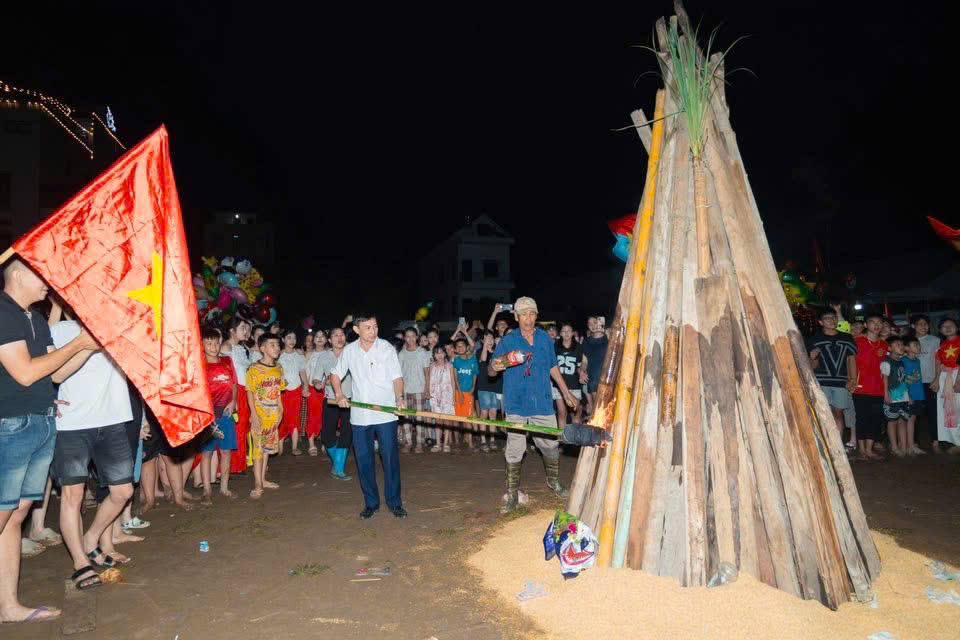 Đồng chí Nguyễn Anh Tuấn- Phó Bí thư Đảng ủy, Chủ tịch UBND xã Hà Bắc thắp lửa trại truyền thống tại điểm Sân vận động Tân Việt