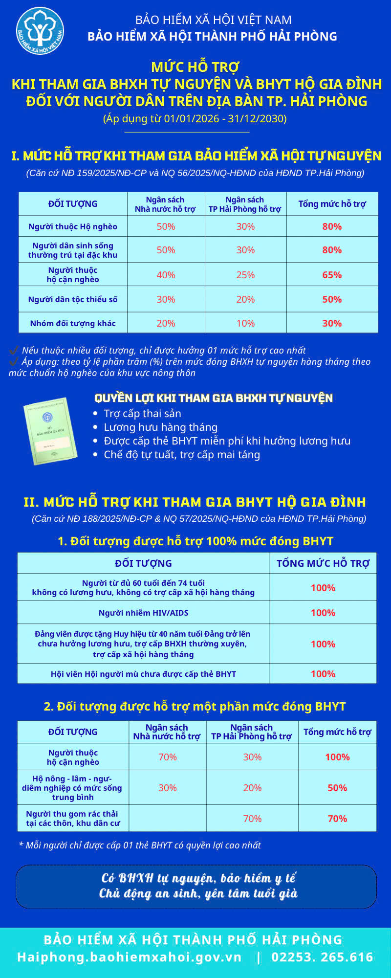 Thực hiện Nghị định số 159/2025/NĐ-CP, Nghị định số 188/2025/NĐ-CP của Chính phủ và các Nghị quyết số 56, 57/2025/NQ-HĐND ngày 11/12/2025 của Hội đồng nhân dân thành phố Hải Phòng, người dân trên địa bàn thành phố khi tham gia bảo hiểm xã hội tự nguyện và bảo hiểm y tế hộ gia đình được hưởng đồng thời chính sách hỗ trợ từ ngân sách nhà nước và ngân sách thành phố với mức hỗ trợ cao, rõ ràng và thiết thực.