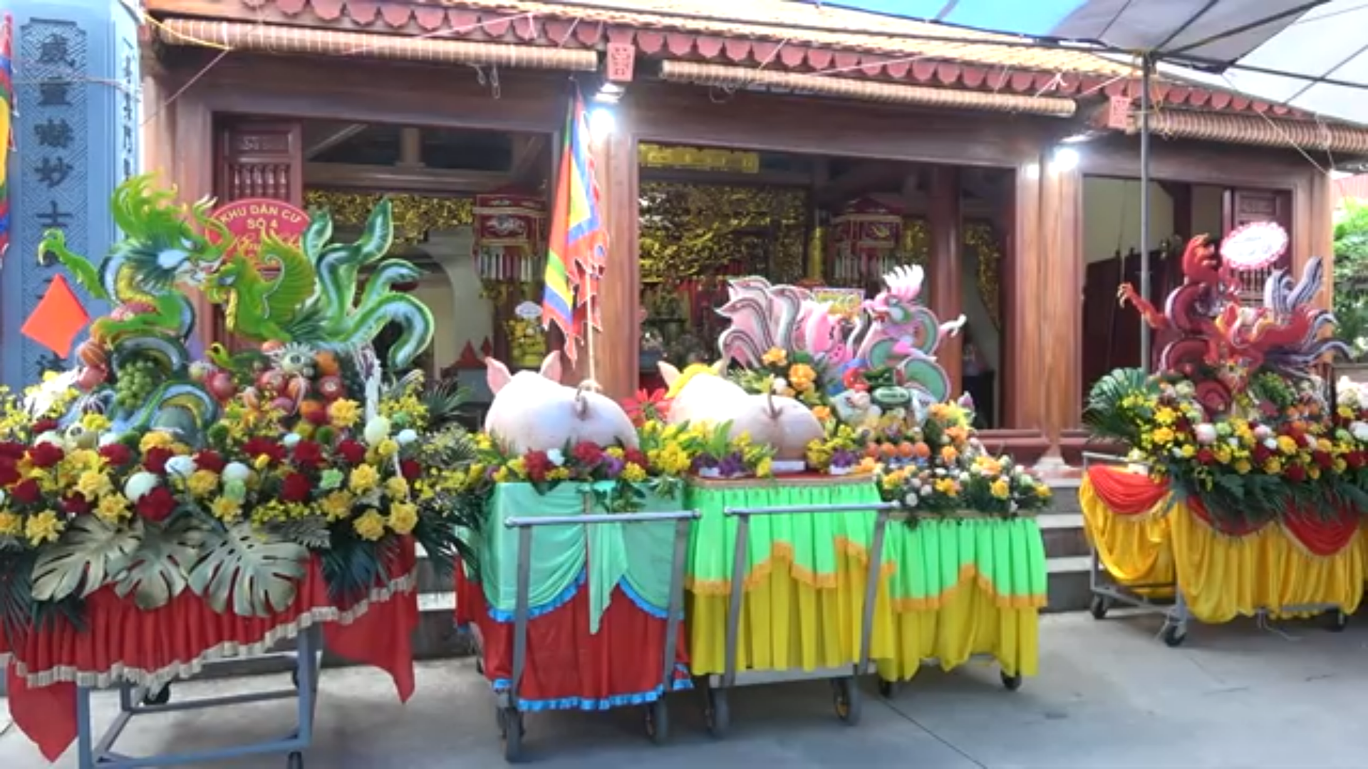 Mỗi cụm dân cư thôn Hải Yến chuẩn bị 1 mầm lễ chay và 1 ông lợn được trang trí đẹp dâng lên thành hoàng làng