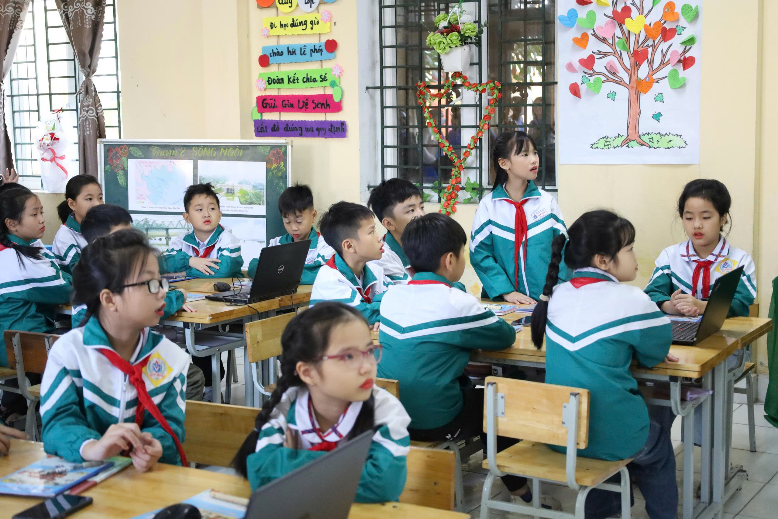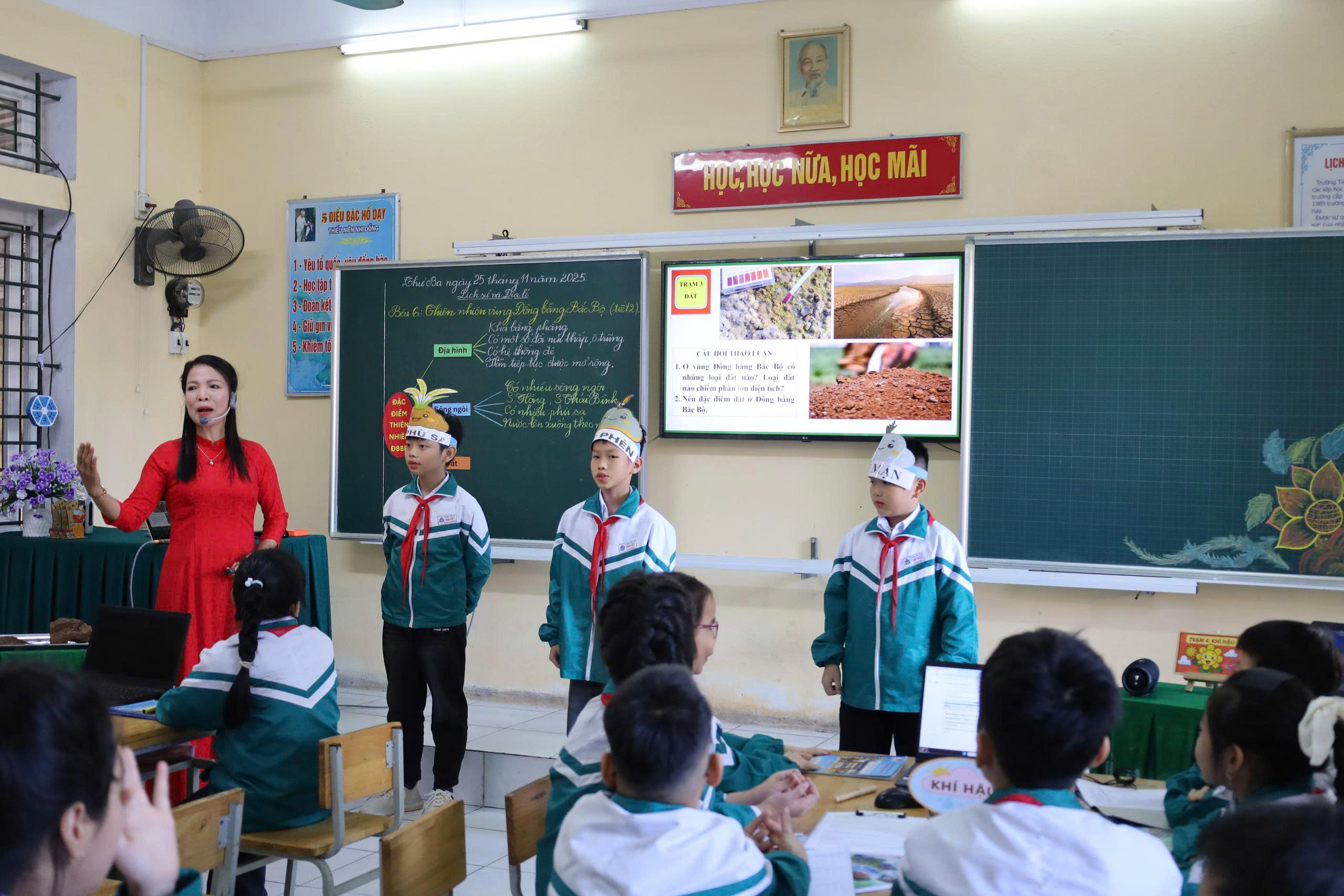 Tại chuyên đề các đại biểu đã được dự tiết dạy thực hành Ứng dụng chuyển đổi số vào giảng dạy nhằm tạo hứng thú cho học sinh Tiểu học ở môn Lịch sử và Địa lí 4 Chủ đề” Đồng bằng Bắc bộ”. Trong tiết dạy giáo viên đã sử dụng các phương pháp dạy học tích cực như: Phương pháp dạy học theo Trạm; hợp tác, khám phá và trò chơi và phương pháp sử dụng công nghệ số, AI.