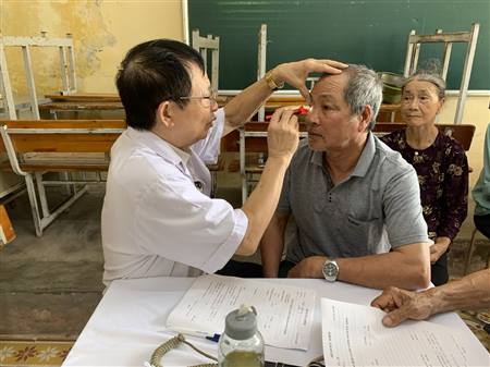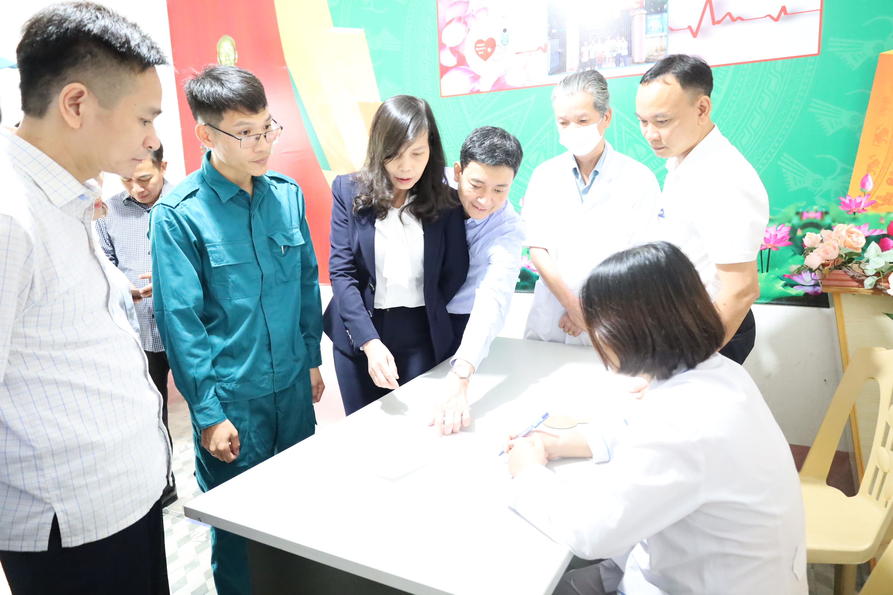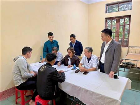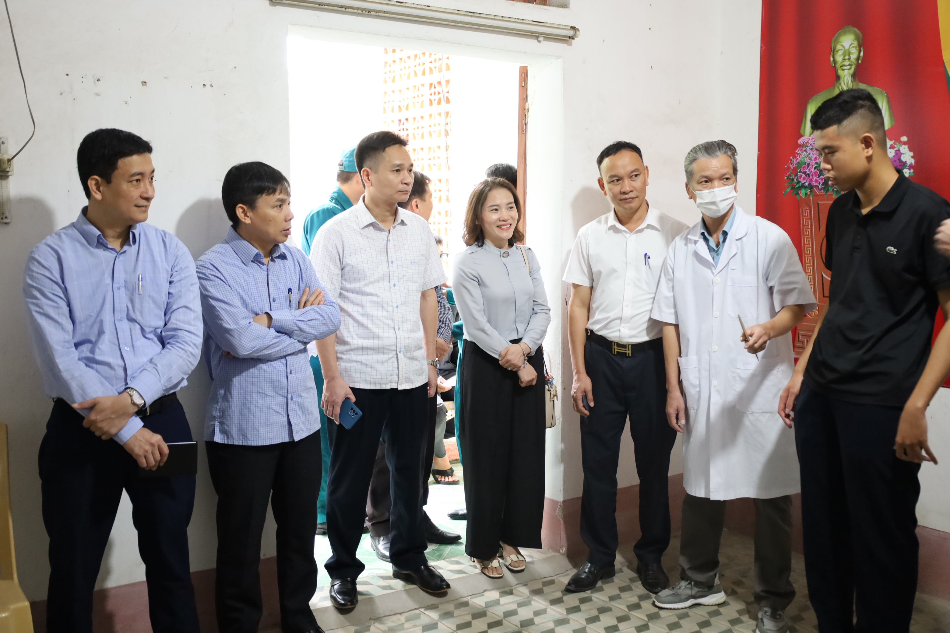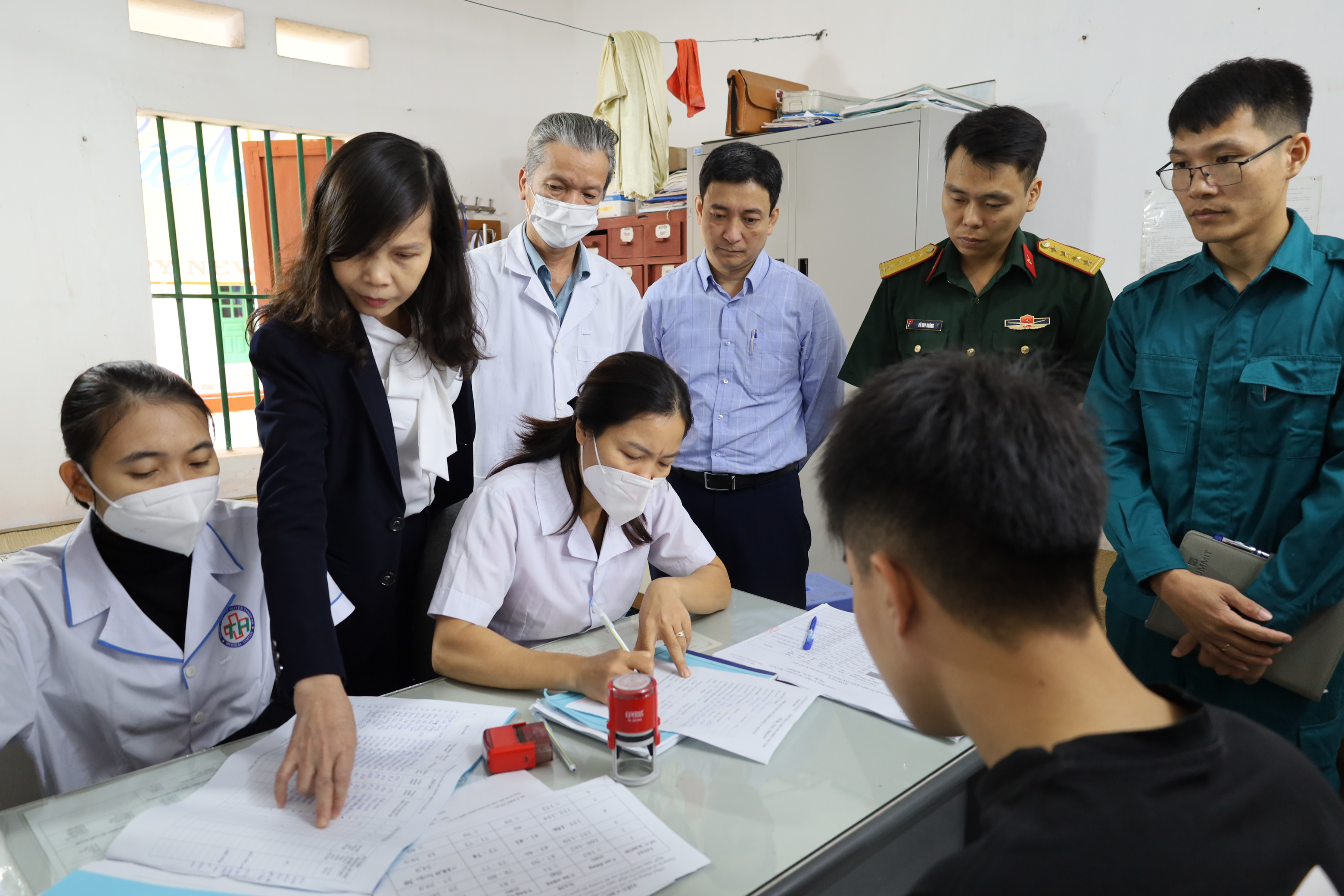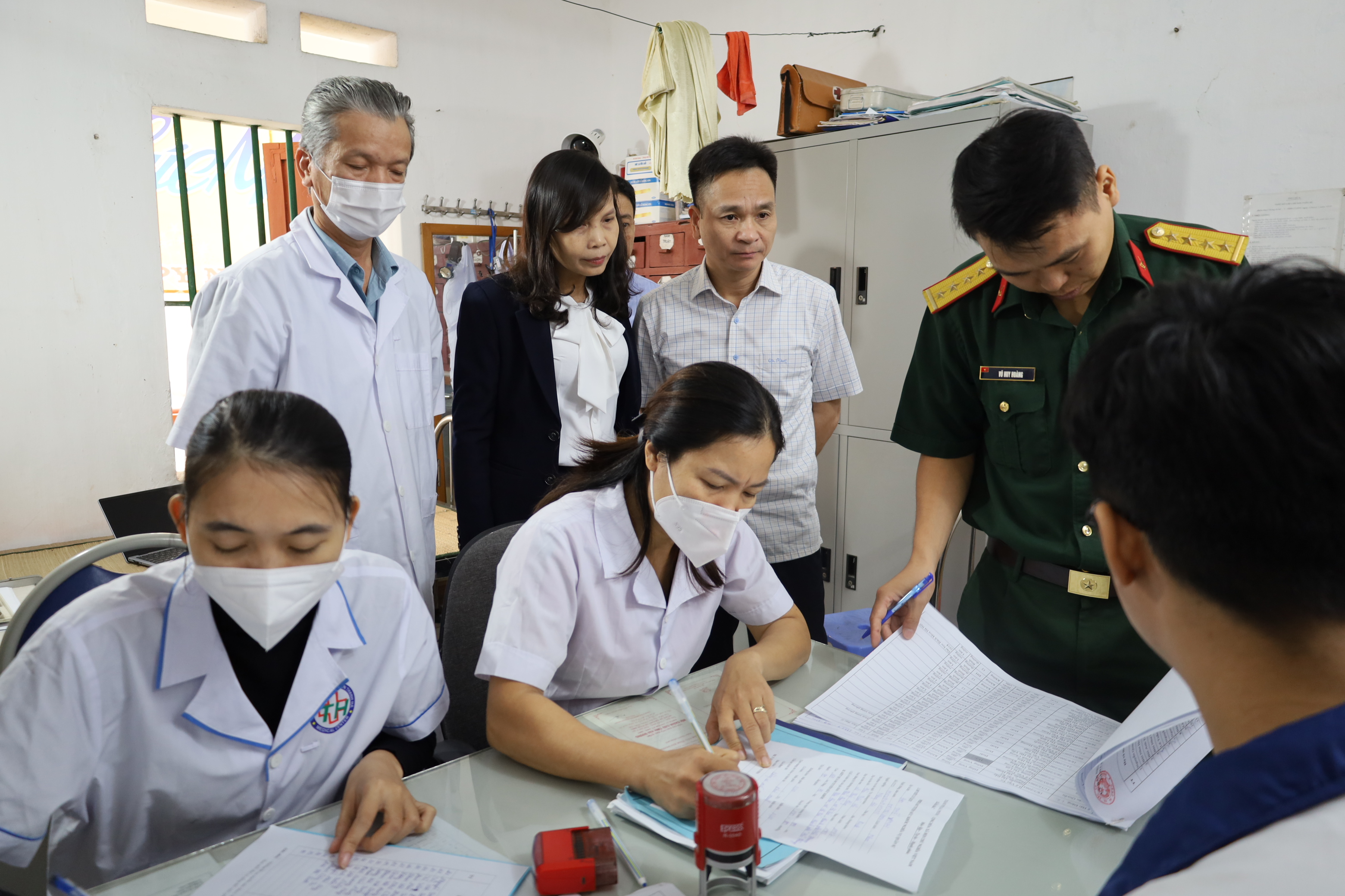 Đồng chí Phạm Văn Hùng-Bí thư Đảng ủy-Chủ tịch HĐND xã cùng các đồng chí lãnh đạo Sở y tế kiểm tra, động viên công tác khám sơ tuyển tại TYT Hà Bắc số 1