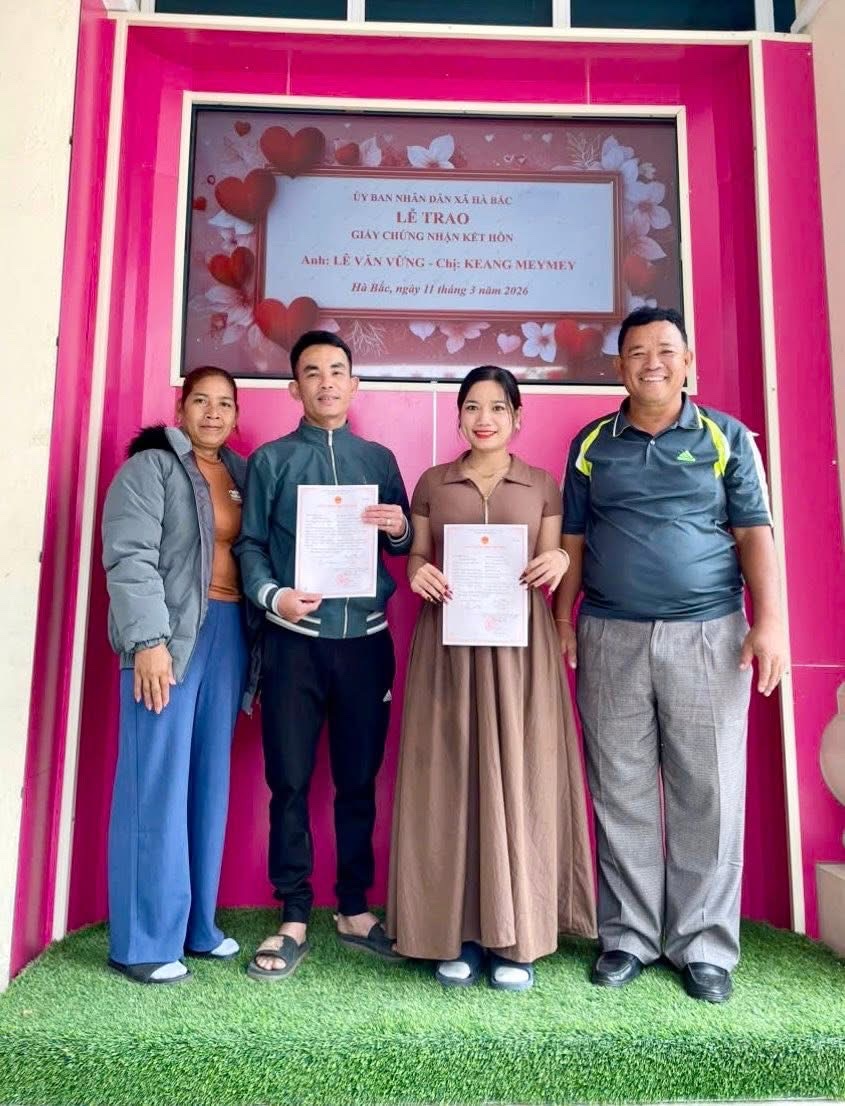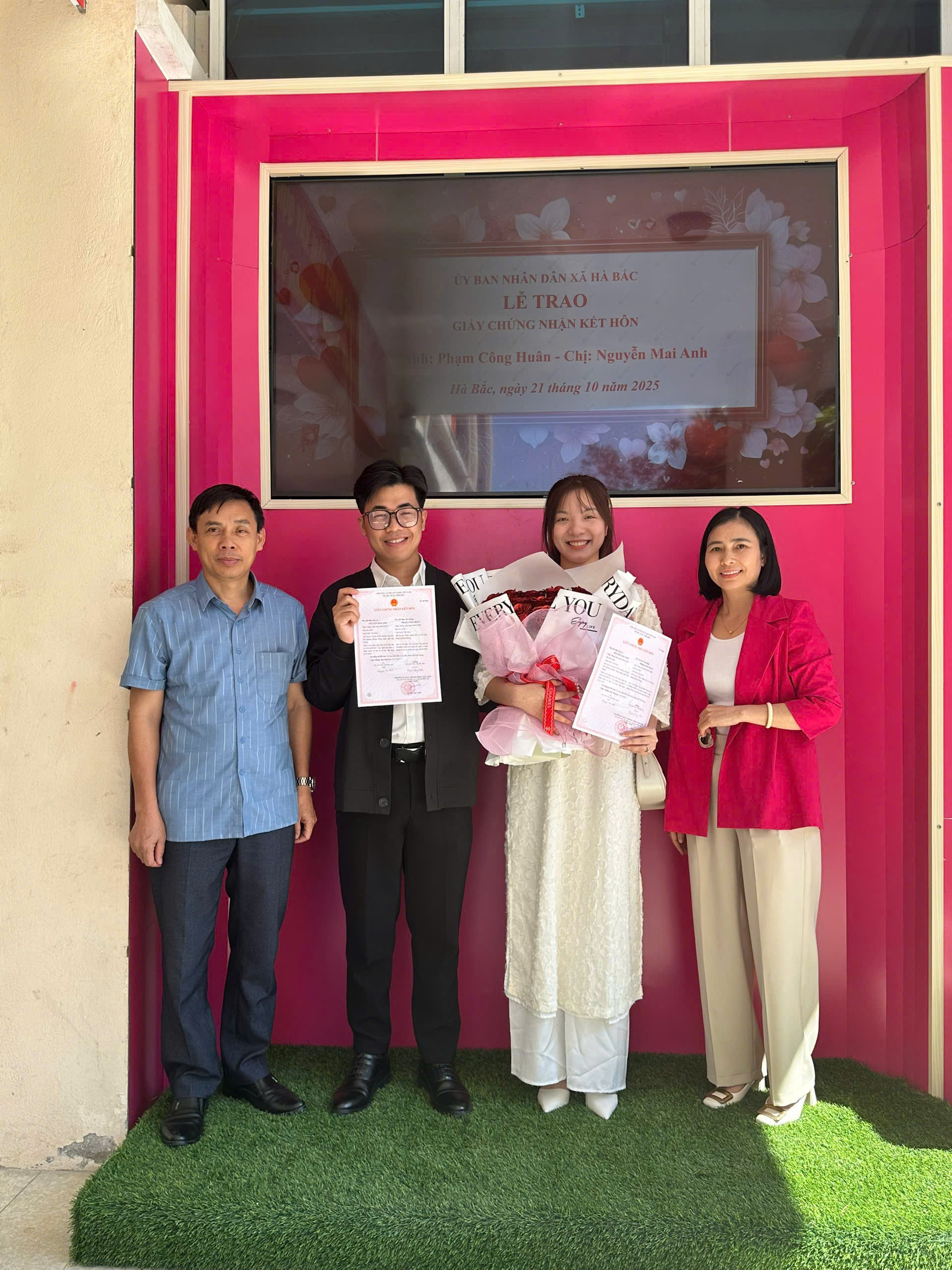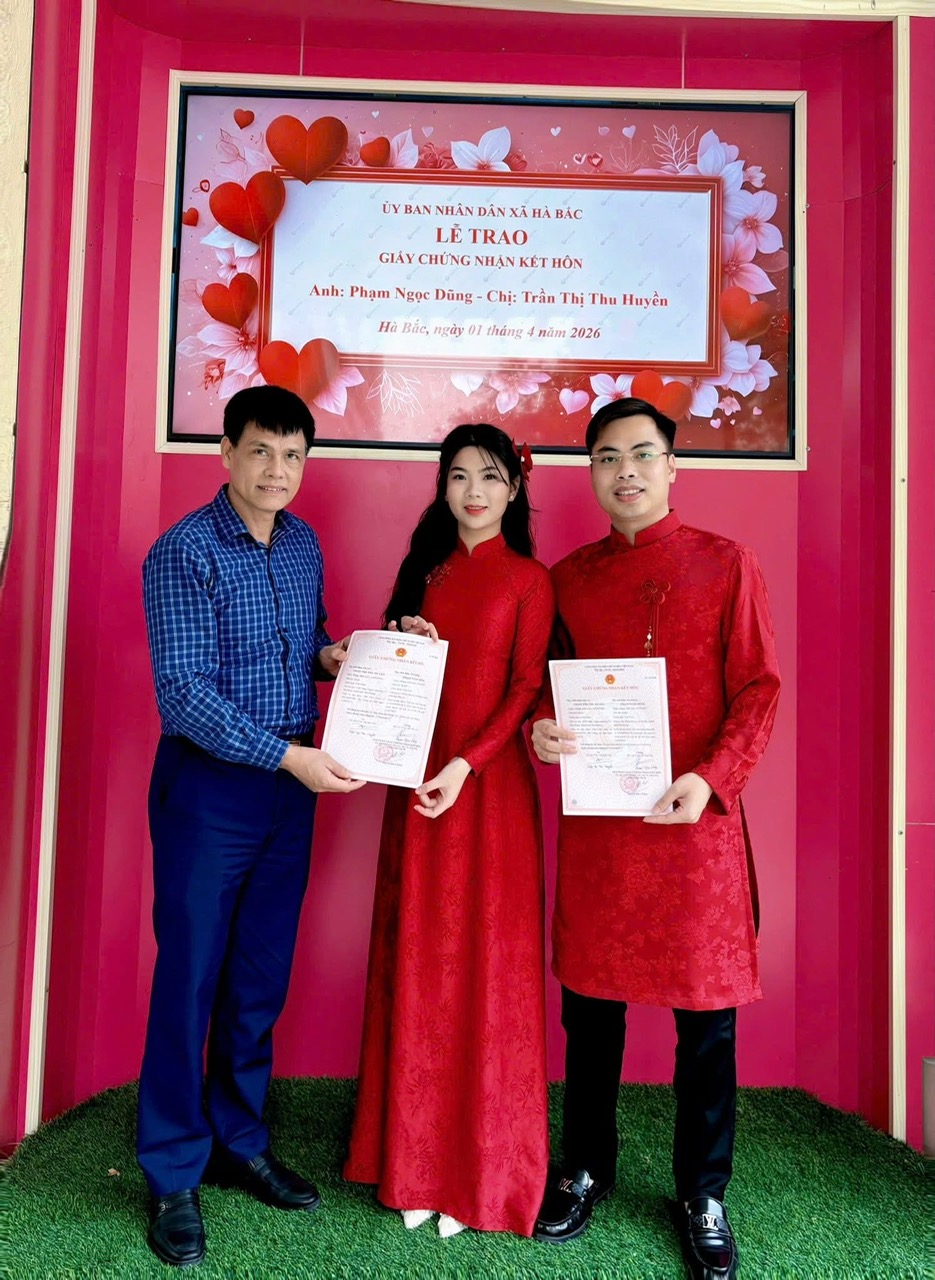 Không chỉ là một thủ tục hành chính đơn thuần, cùng với trao giấy chứng nhận kết hôn, đôi bạn trẻ được lãnh đạo UBND xã Hà Bắc và cán bộ tư pháp phổ biến các nội dung chính trong Luật Hôn nhân và Gia đình. Đồng thời, tuyên truyền về trách nhiệm xây dựng gia đình văn hóa, bình đẳng giới và chăm lo cho thế hệ tương lai… cho các cặp đôi.